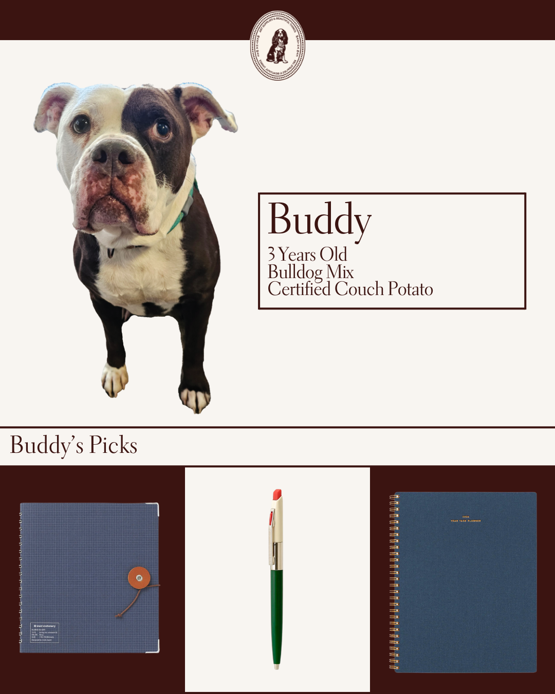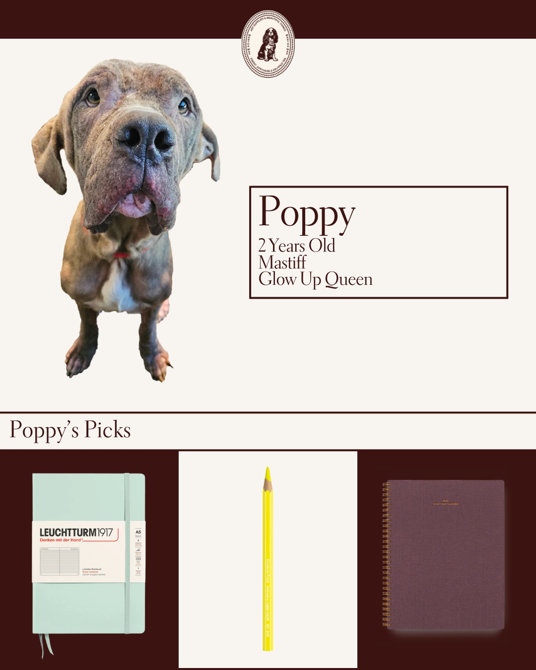 'Tis the season to relax. Poppy was found starved and surviving on a Chicago street. She’s glowing up like a rainbow on a cloud. Her body tells a hard to hear story, but we’re looking forward to seeing what the next chapter has in store. She’s got a John Hughes main character moment coming up and we can’t wait to see who shows up with a boombox. Don’t tell her, but we’re totally embossing this beautiful German notebook for her as a surprise. We love a metallic detail!