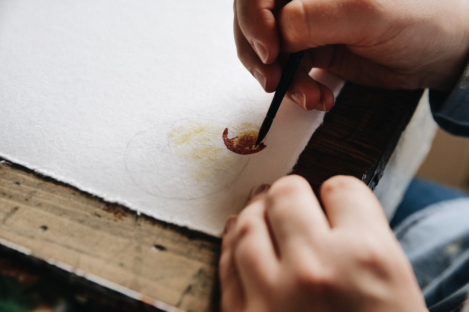 After layering the colors of your fruit body, wait a few minutes for the pigments to dry. Once your fruit colors have dried, go in with a fine tip brush to add the stem and fine details.