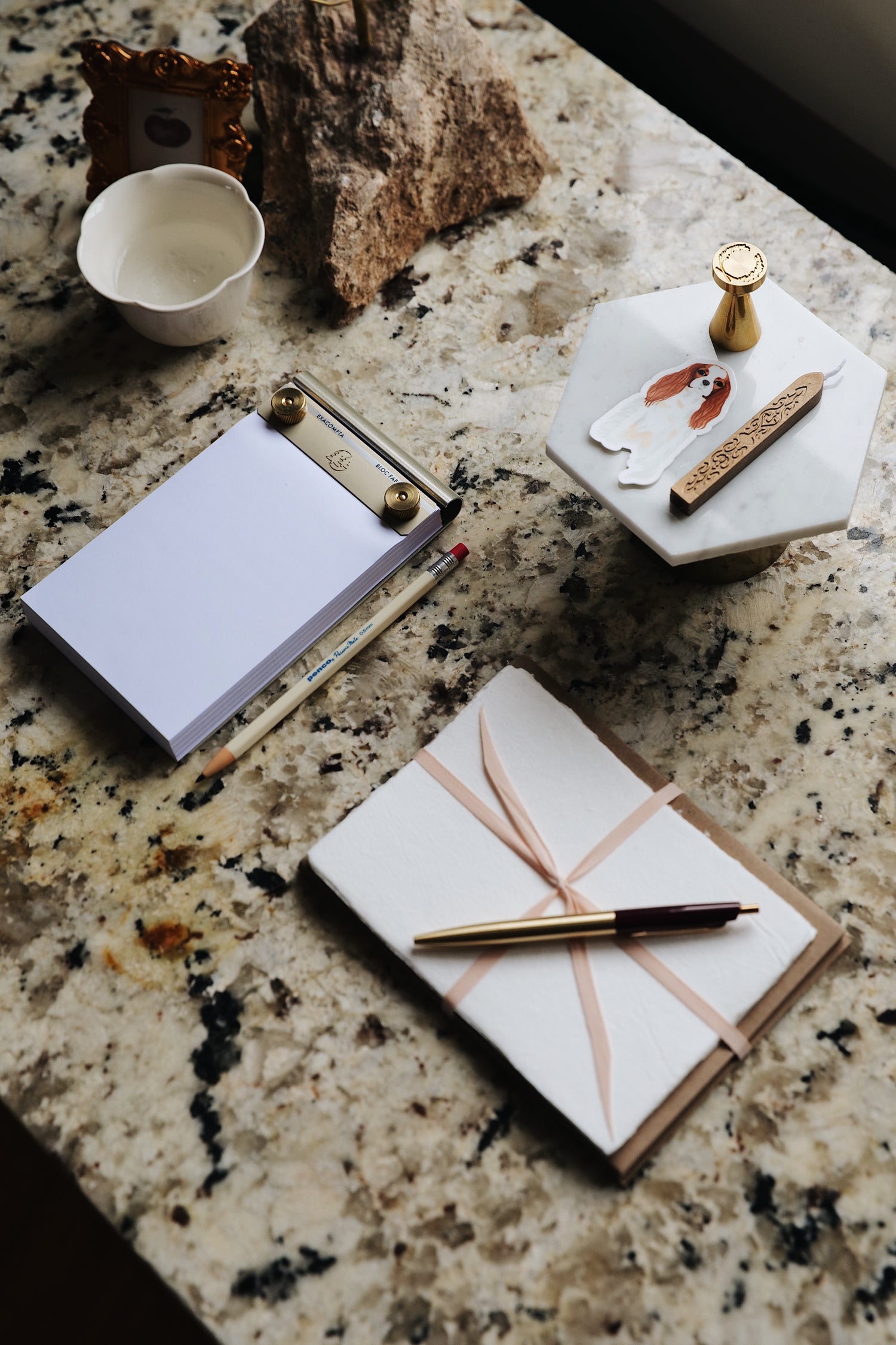 Writing really flows when you love your writing utensil. Grab a pen that feels good in your hand. One that has a full ink cartridge so there are no skips in your thoughts. The Anterique Brass Ballpoint Pen weighs 26 grams, creating the perfect balance in your hand. If you really want to lean into letterwriting, might we suggest a glass dip pen. Build up your ink collection and write each note in a different color. It keeps things interesting!