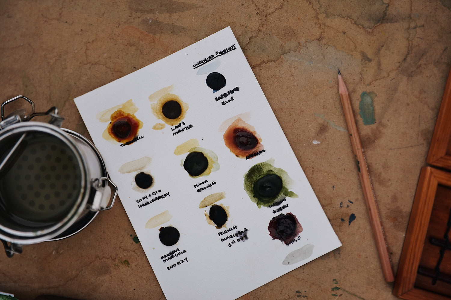 The workshop's natural honey watercolors are made from dye crops grown by The Roof Crop and kitchen scraps from Maxwells Trading. The first step is to extract pigment from the source material, such as marigold, avocado, and indigo. Afterwards, the pigment is combined with an inert substrate to create a lake pigment, which is then washed to remove extra minerals. The dried pigments are then mixed with a binding material, consisting of distilled water, honey, and gum arabic.