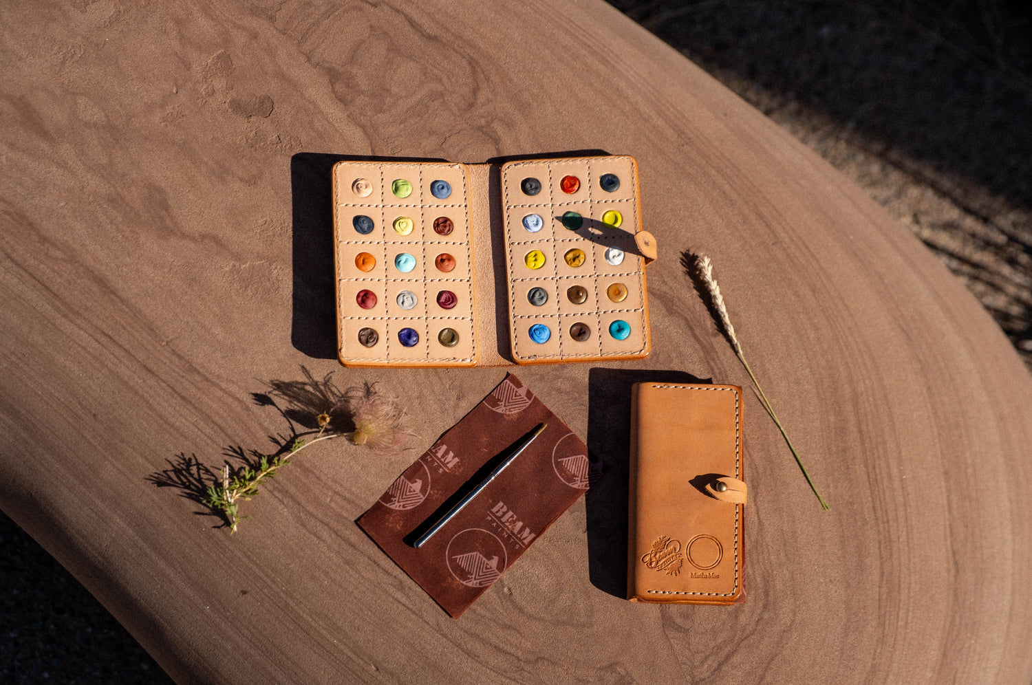 A handmade leather natural watercolor palette by Martha Mae and Beam Paints made in collaboration with Tundra Leather.