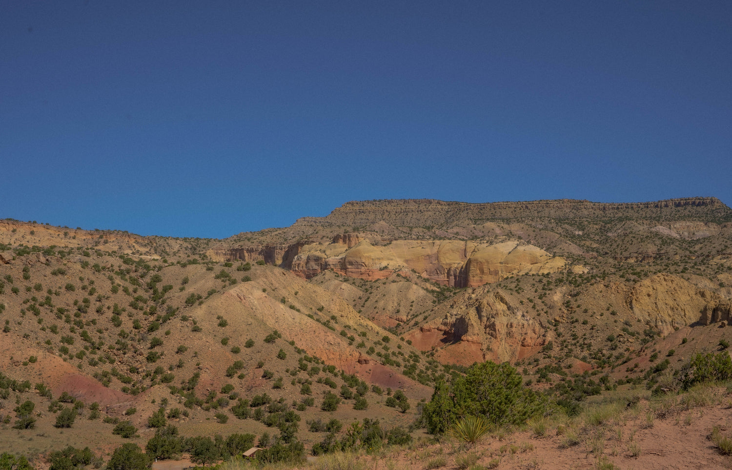 Often remaining secluded, O’Keeffe noted that the ranch sparked something inexpressible to her. She loved the vast terrain, the bright blue sky, and the intense, hot sun. It’s said that she painted Pedernal, the flat-topped mountain that sits just south of Ghost Ranch over 28 times. She referred to it as her mountain and joked that "God told her if she painted the mountain enough, he’d give it to me". Today, many people still call Pedernal, O’Keeffe’s Mountain.