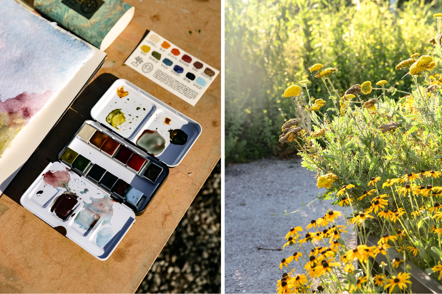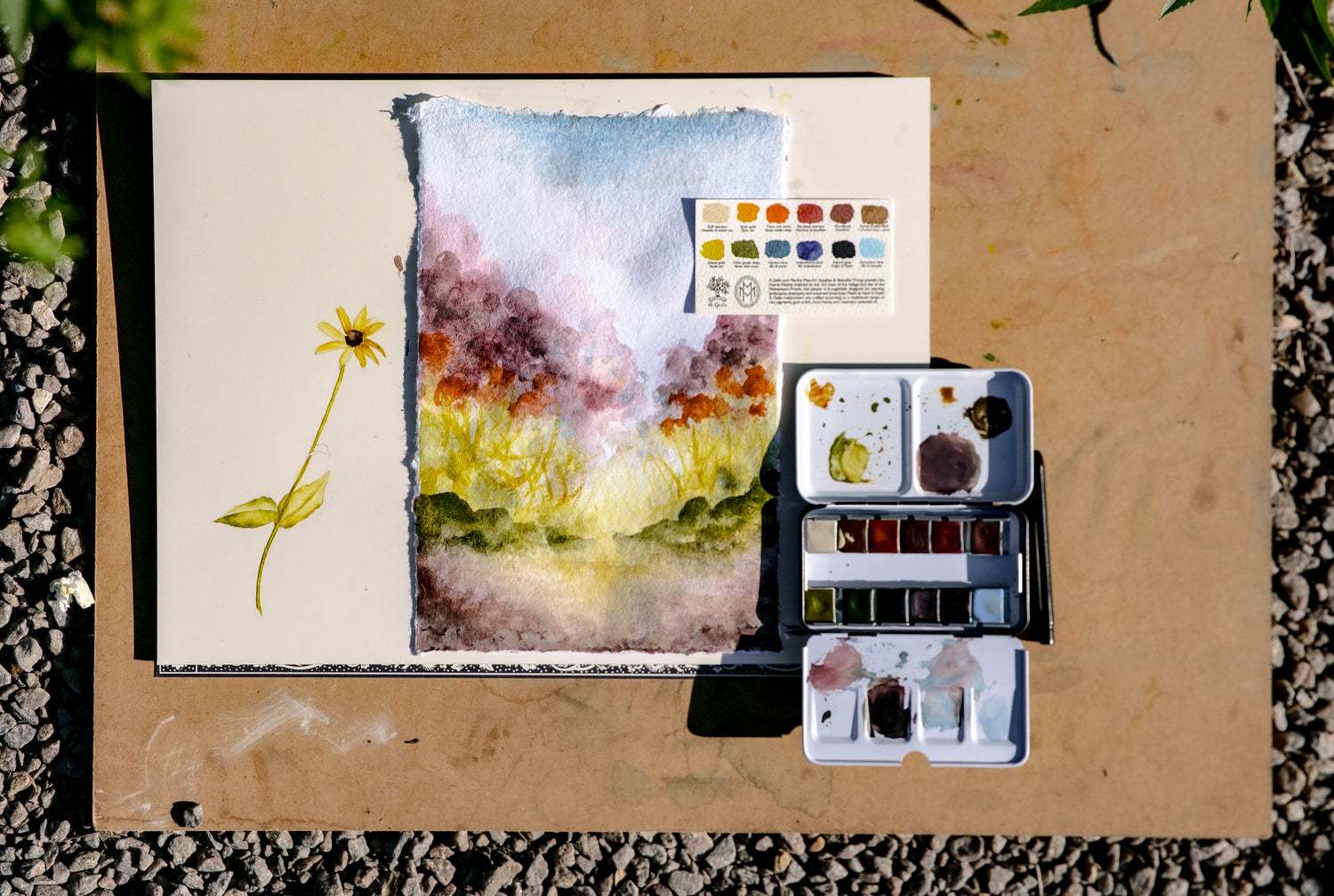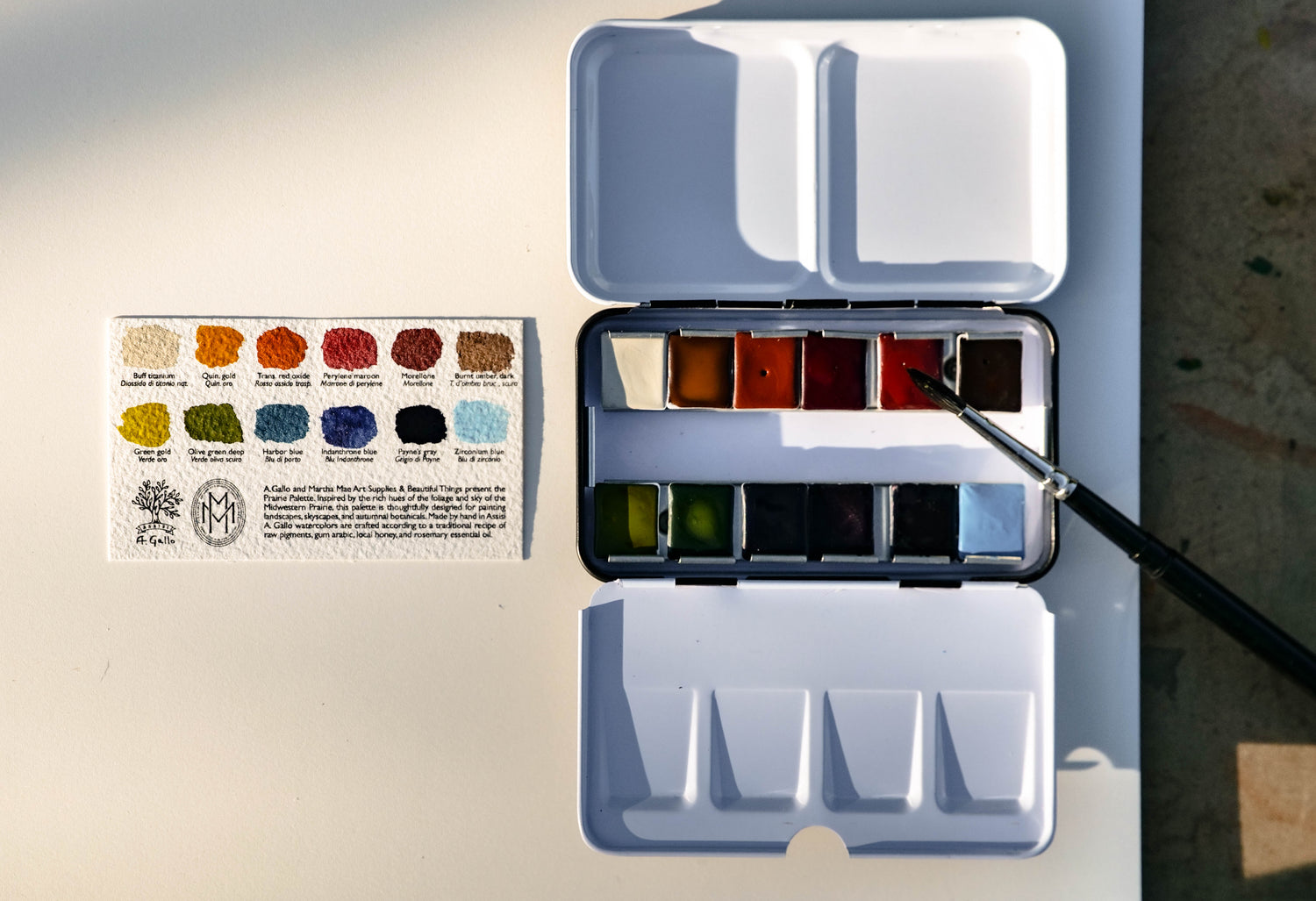 Drawing inspiration from the rich hues of the foliage and sky of the Midwestern Prairie, we thoughtfully designed this palette for painting dramatic landscapes, skyscapes, and autumnal botanicals. Made by hand in Assisi, Italy, A. Gallo watercolors are crafted according to a traditional recipe of raw pigments, gum arabic, local honey, and rosemary essential oil.Â