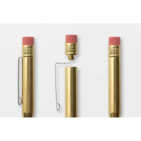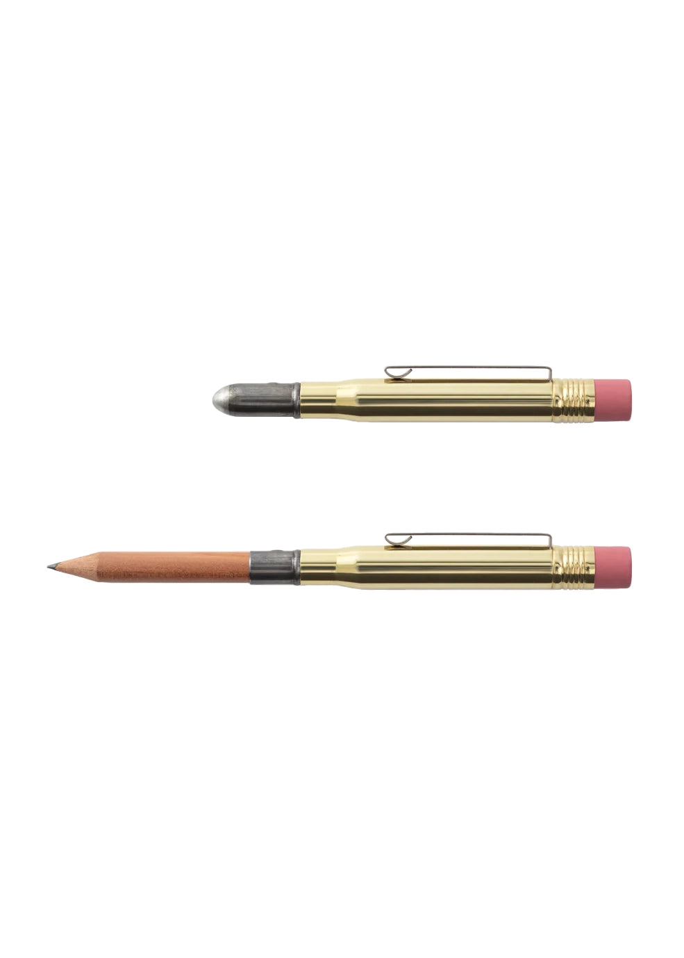 A refillable brass pencil that ages with use and fits perfectly into your pocket. The pencil has a brass casing to protect the point and replaceable graphite pencil and eraser. Available in pure brass, white enamel over brass and brown enamel over brass.