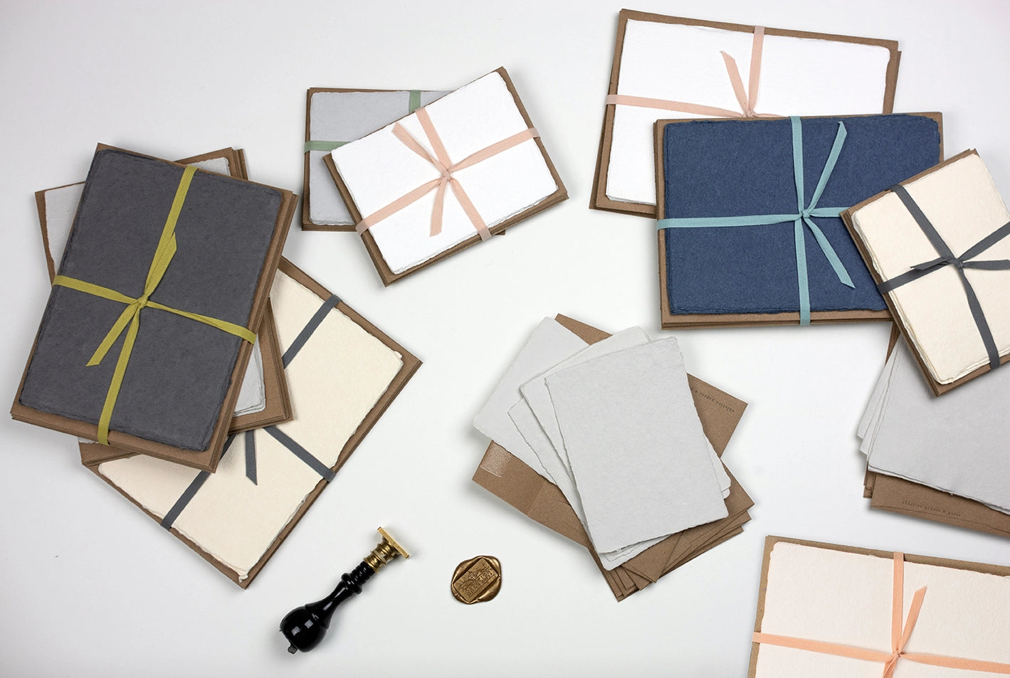 Flat handmade paper packs to use for letter writing, art projects, table settings, or greeting cards. The deckled edges are soft, giving the paper a sense of thoughtful movement. These 5" x 7" cards are packaged in sets of 6 with 6 kraft paper envelopes tied in an Italian cotton ribbon.