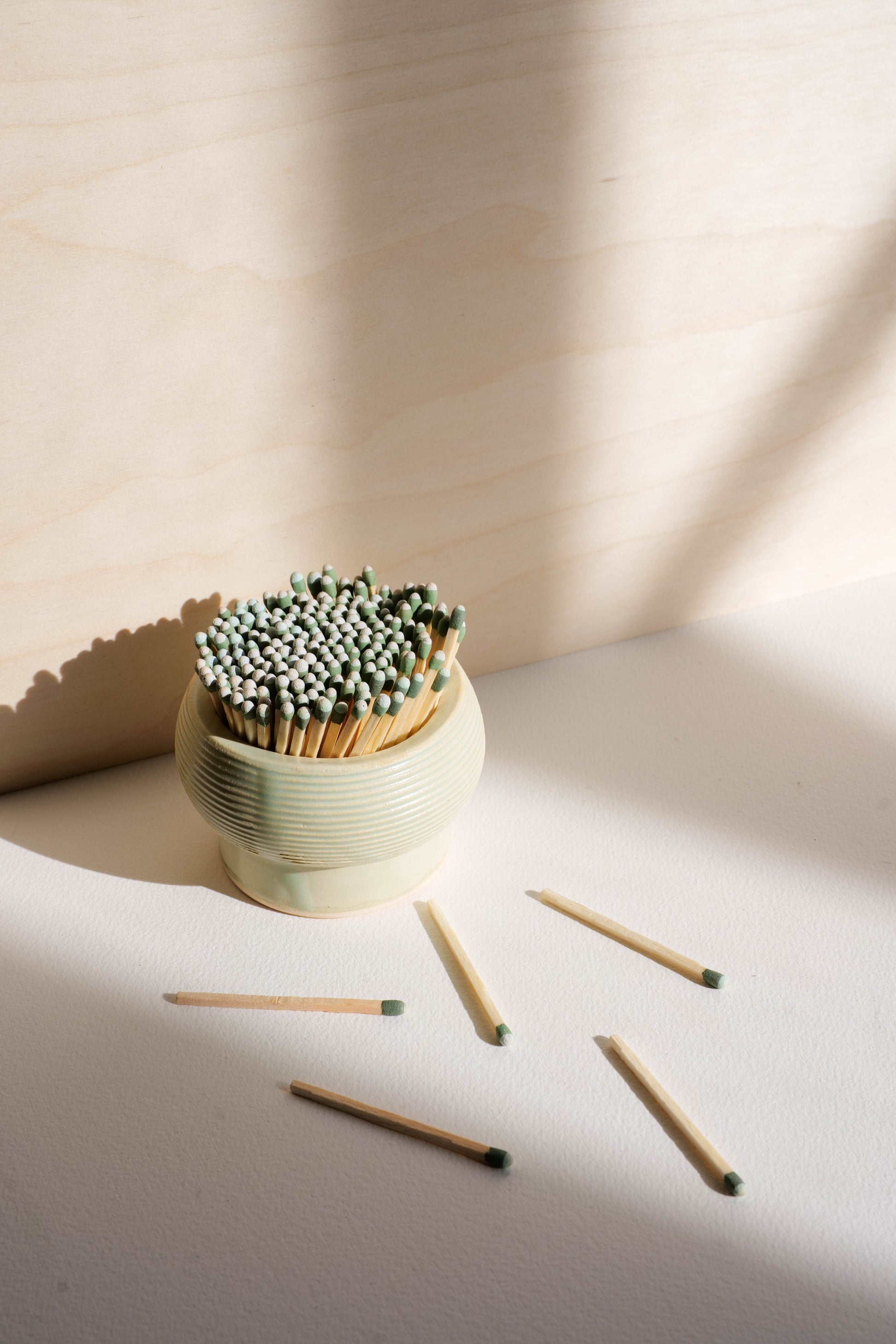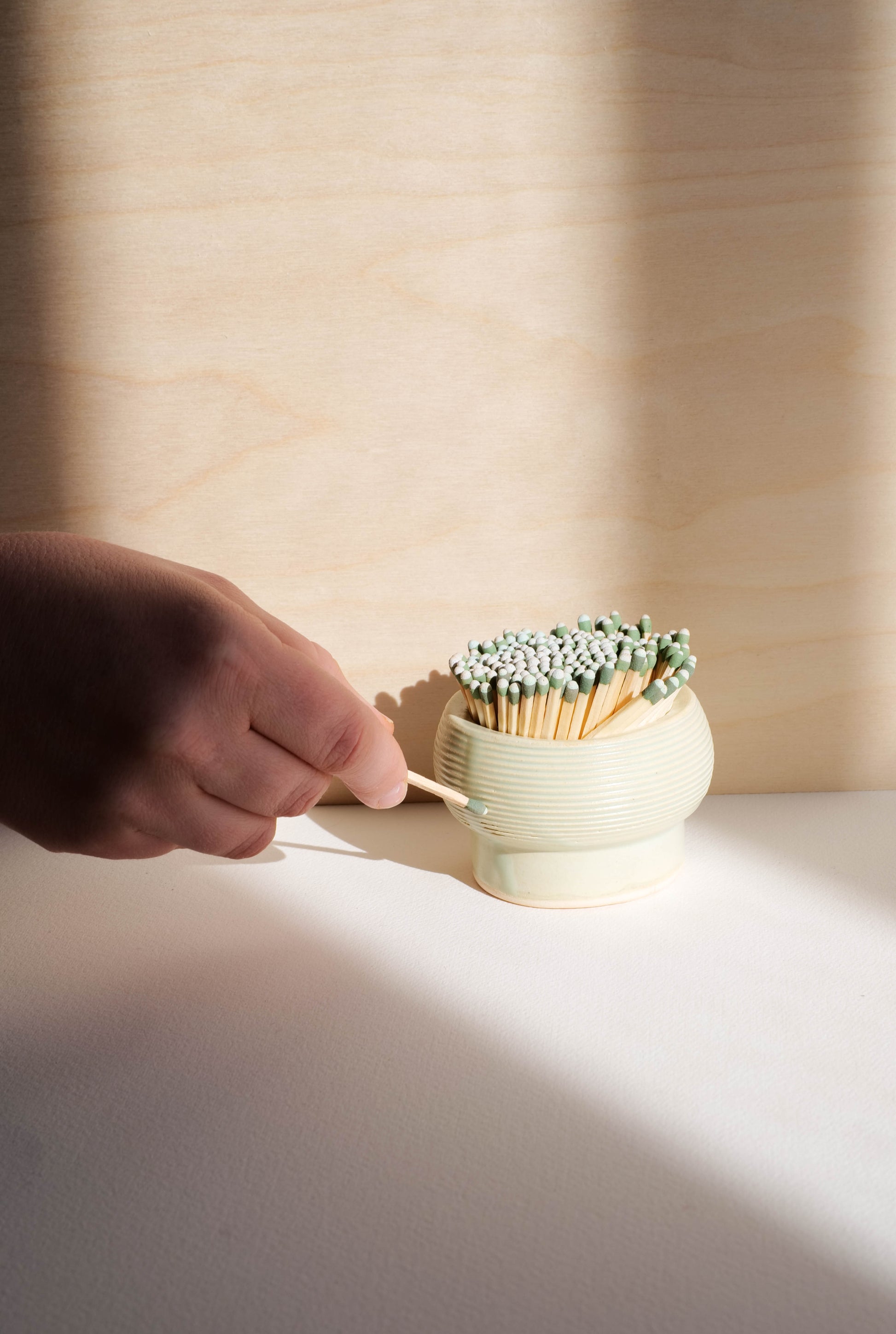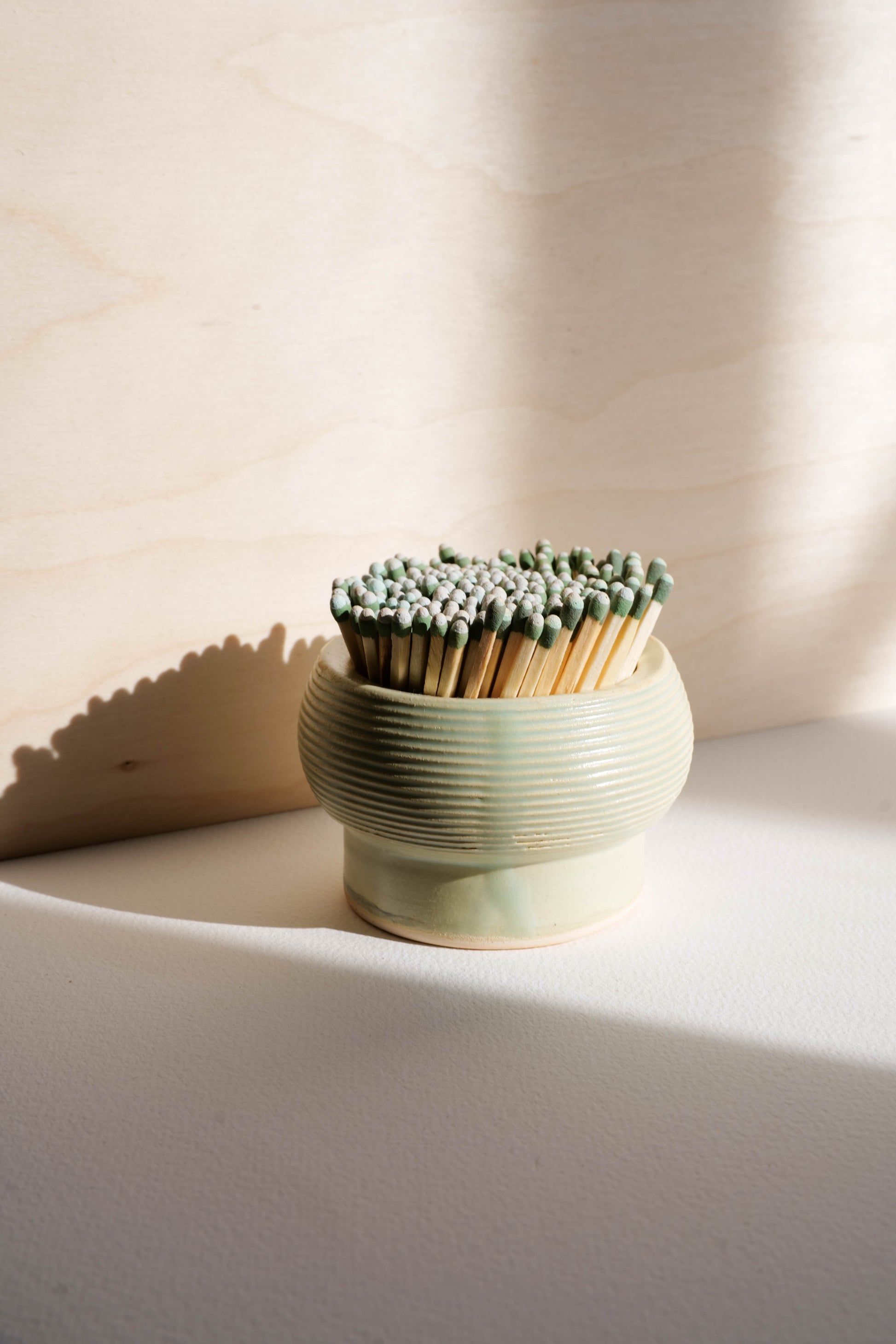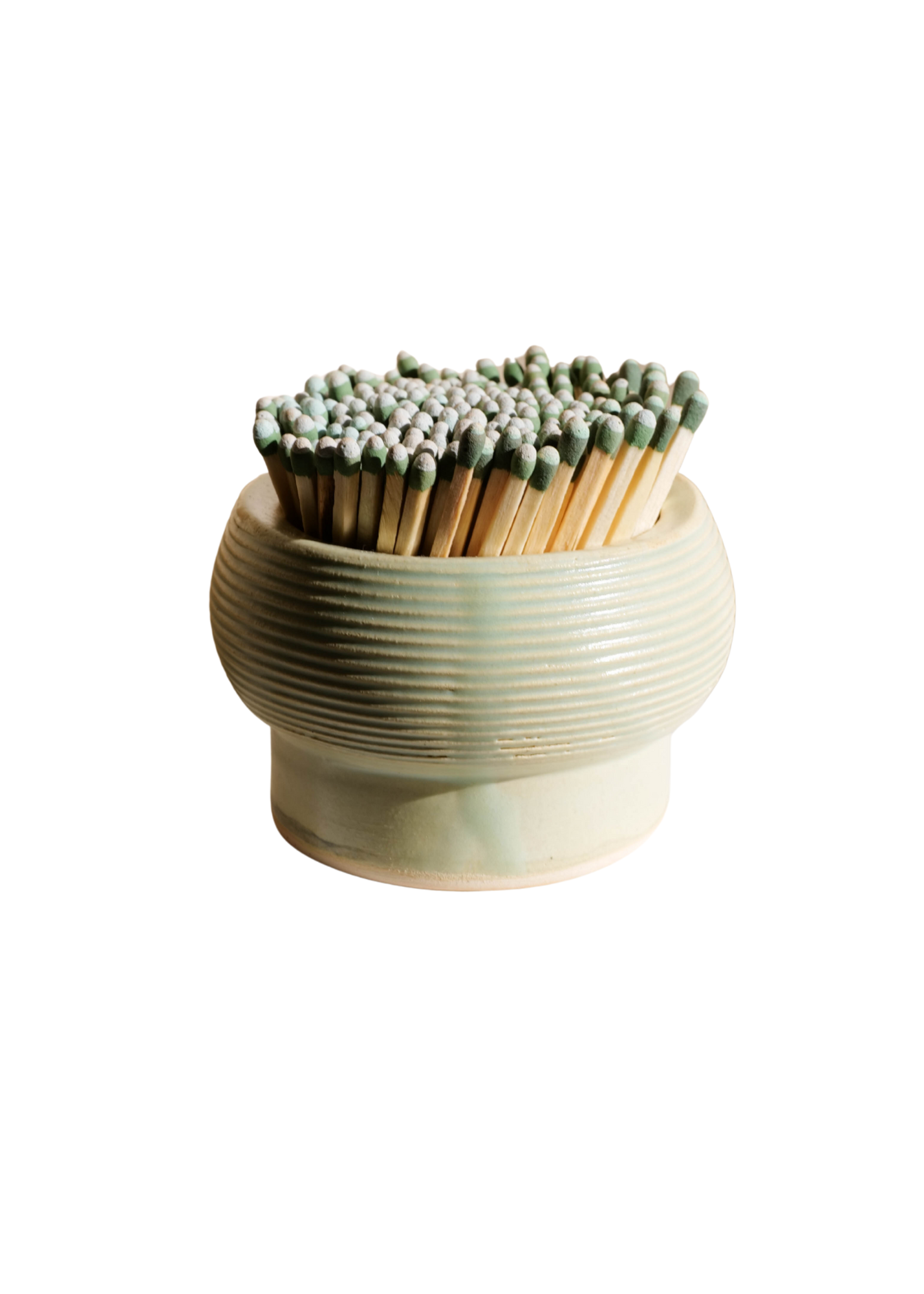 Wheel-thrown, stoneware match strike glazed in a light mint. Filled with strike-anywhere matches, use the match strike to light matches for candles and incense. Strike downward on the ridges to light the match. We worked with Julia Finlayson of Grandmont Street on an exclusive collection of pieces for Martha Mae made in Evanston, IL.