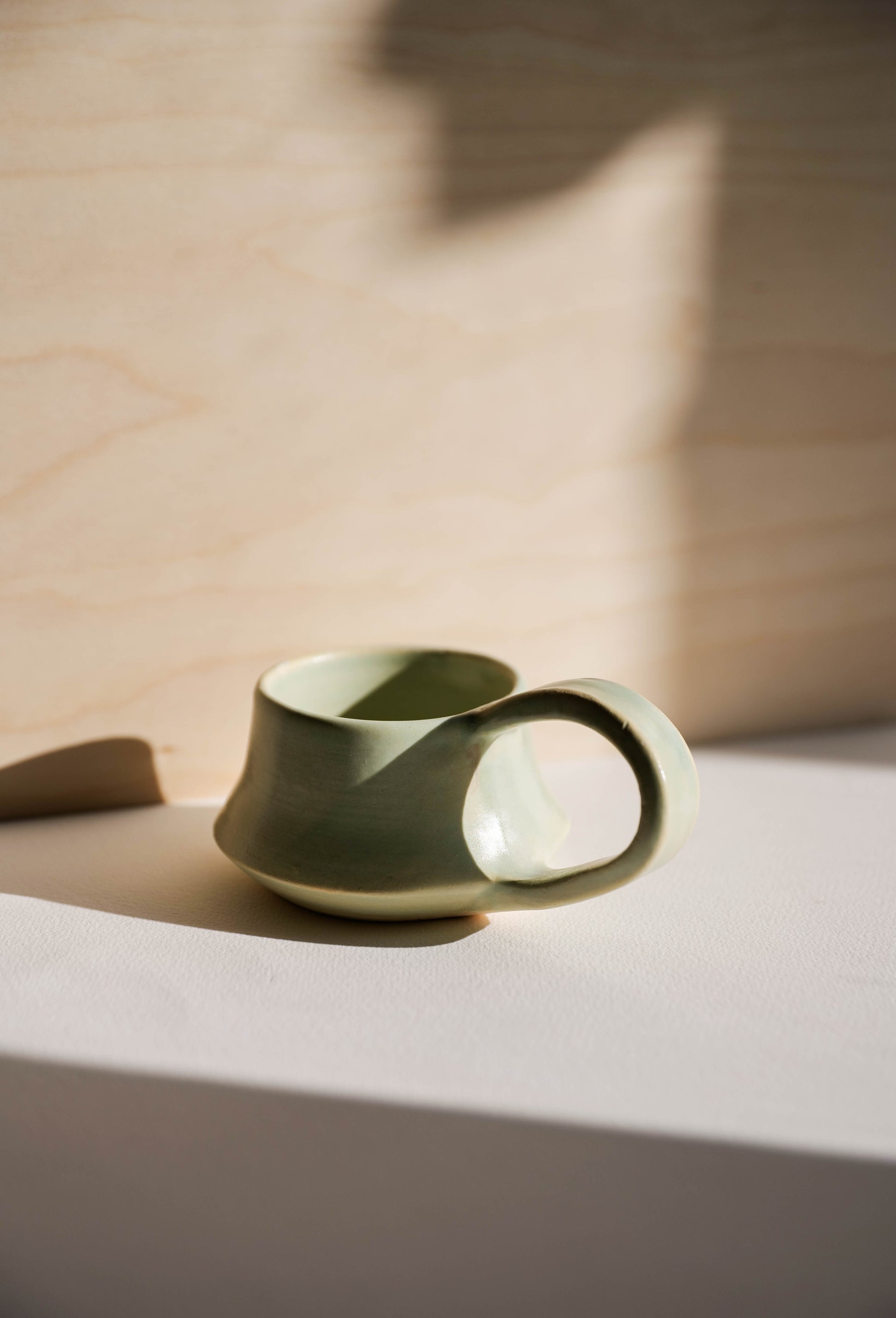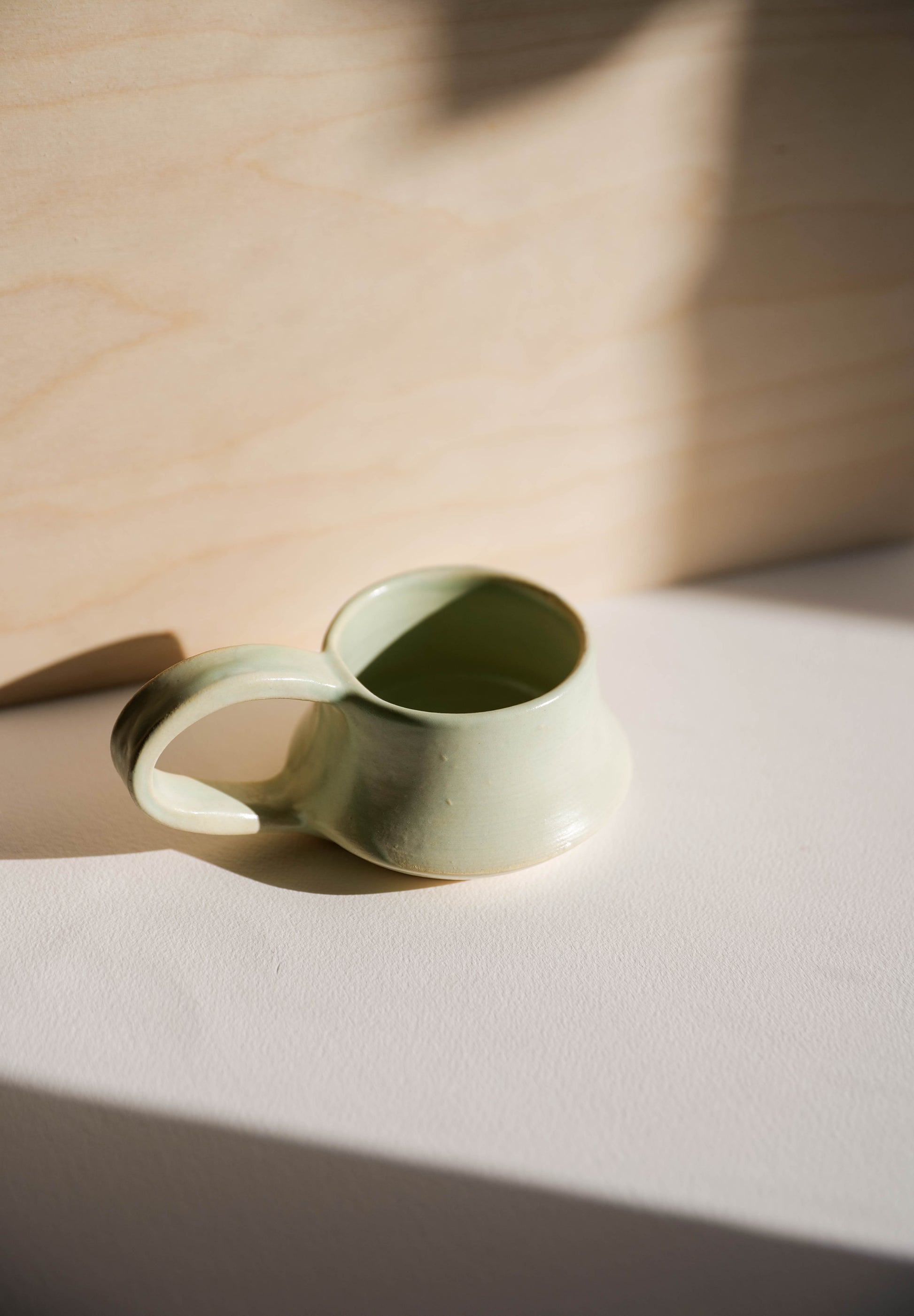 Wheel-thrown, one of a kind stoneware mug glazed in a light mint. The wide handle make this mug a delight to hold. We worked with Julia Finlayson of Grandmont Street on an exclusive collection of mugs for Martha Mae made in Evanston, IL.