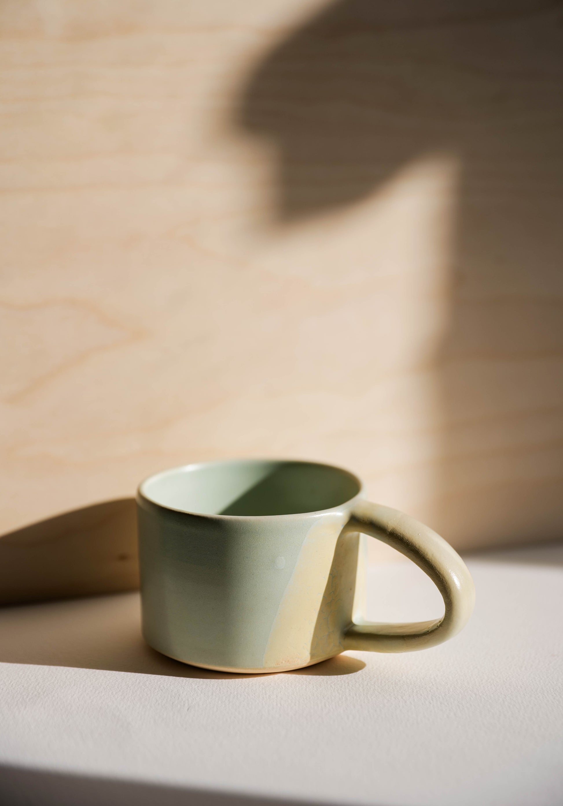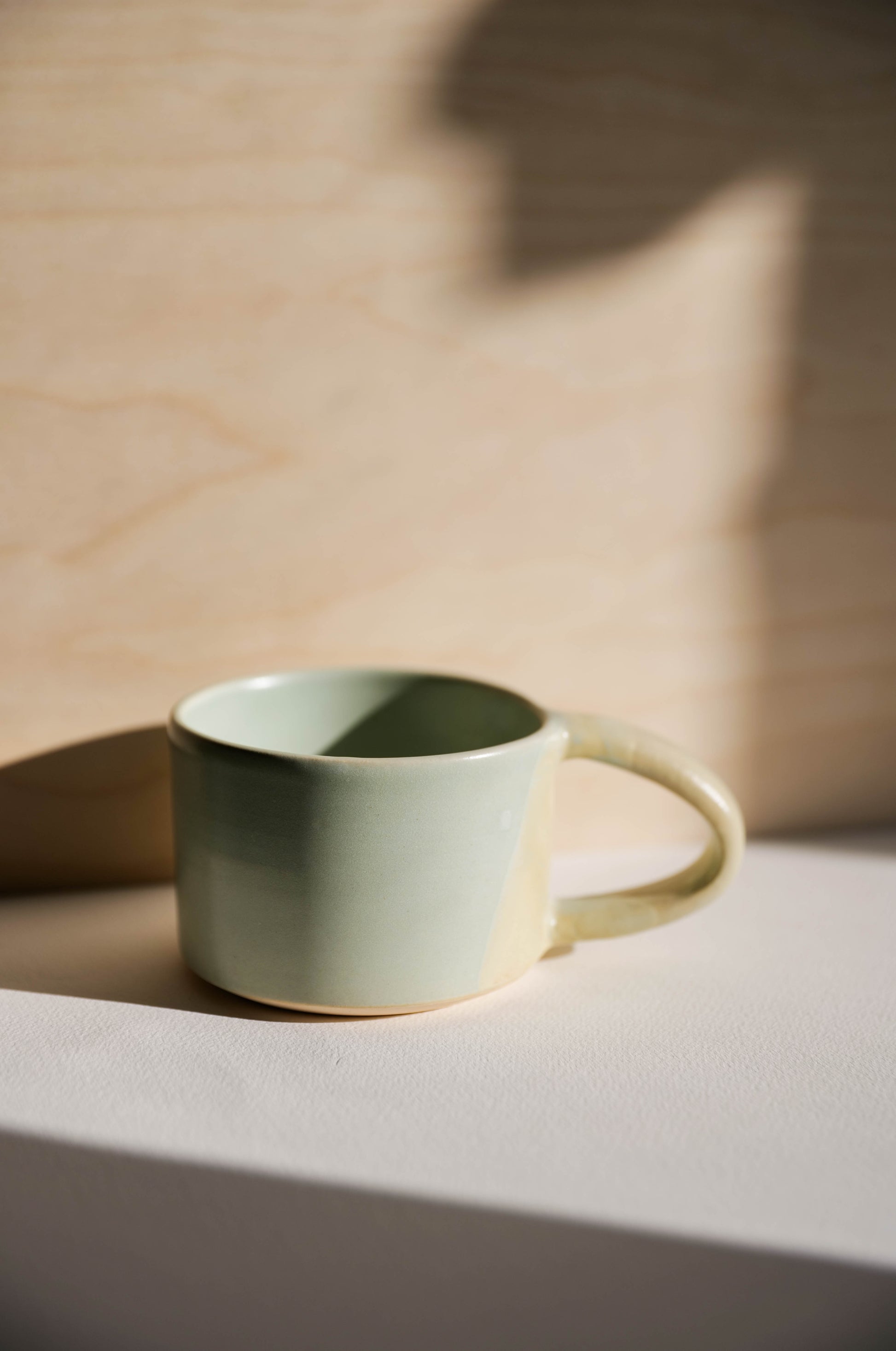 Wheel-thrown, one of a kind stoneware mug glazed in a light mint. The wide handle make this mug a delight to hold. We worked with Julia Finlayson of Grandmont Street on an exclusive collection of mugs for Martha Mae made in Evanston, IL.