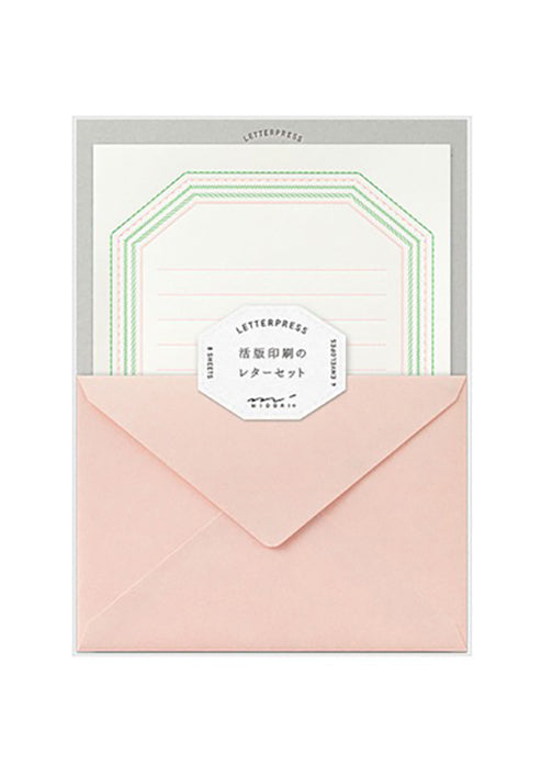 This beautiful Japanese stationery set from Midori is made by hand using a traditional letterpress technique. Included are eight sheets of textured writing paper with an embossed frame around a lined center with four envelopes to match.