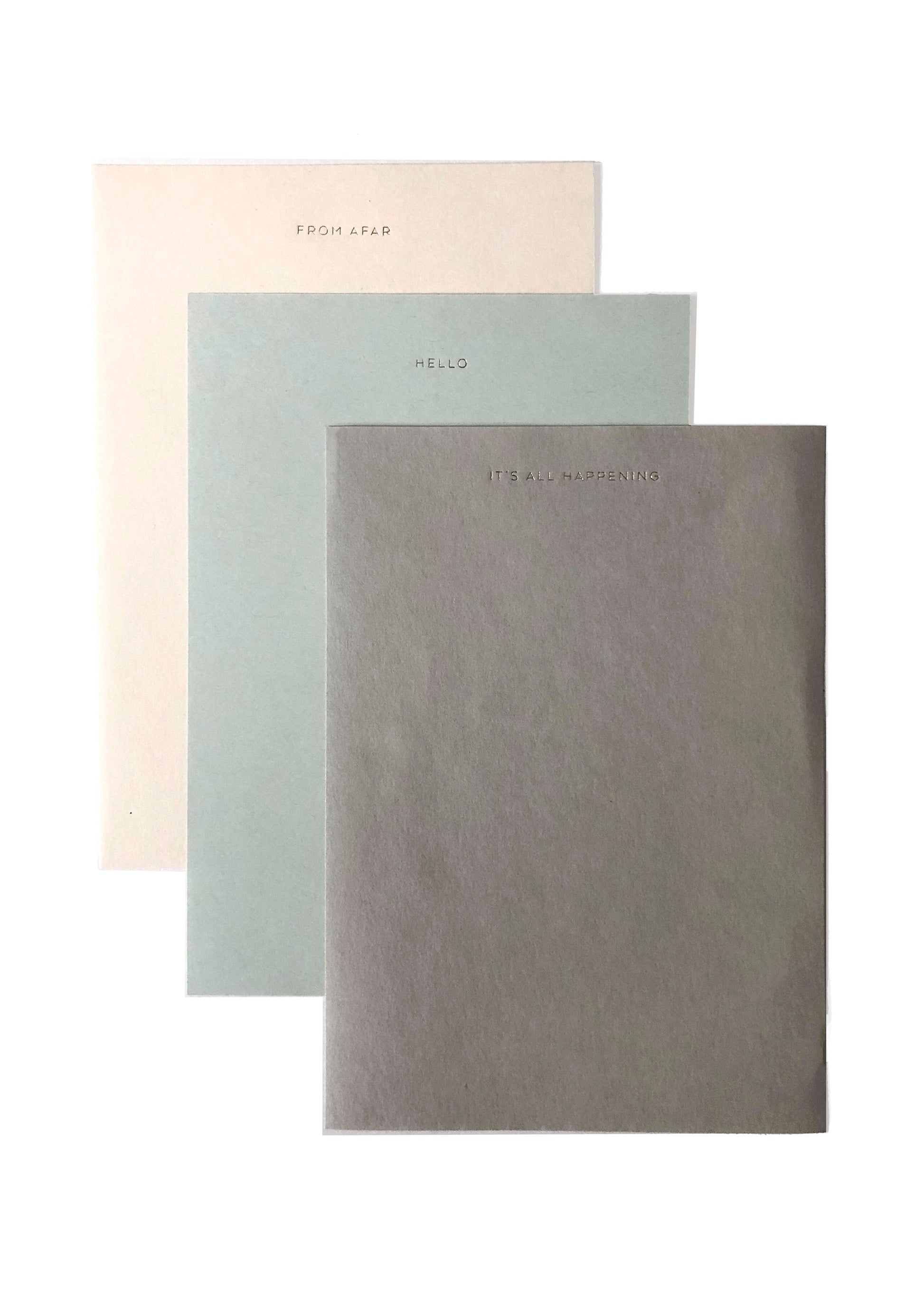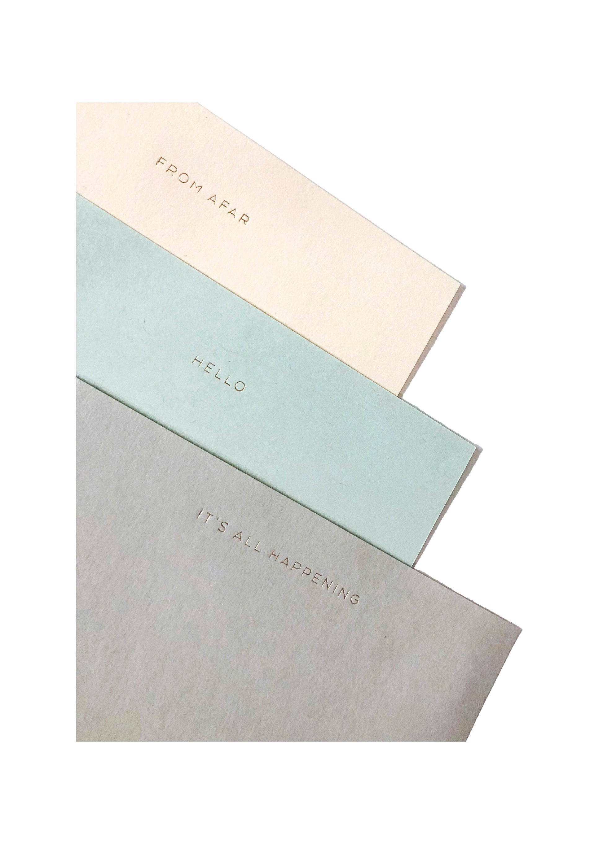 This lovely set of eight A7 memos by Tiny Bones Press are sustainably printed using gold foil on recyclable moss-colored paper. The thin stock sheets are meant to be folded in half to fit into the included white 4 bar envelopes. Each memo has "it's all happening" printed at the top in a delicate gold type. The memos and envelopes come enclosed in a white box.