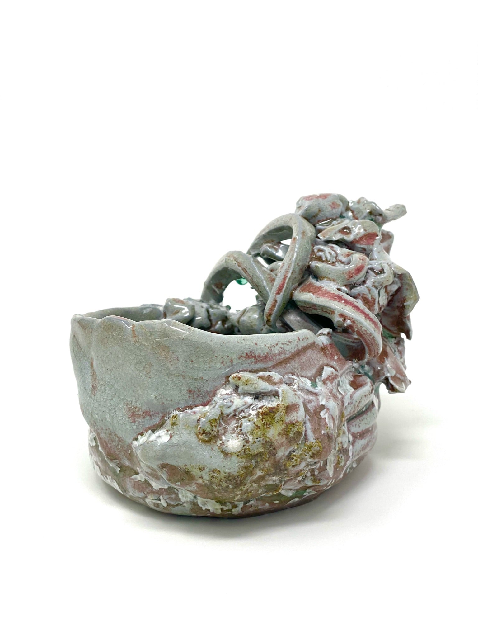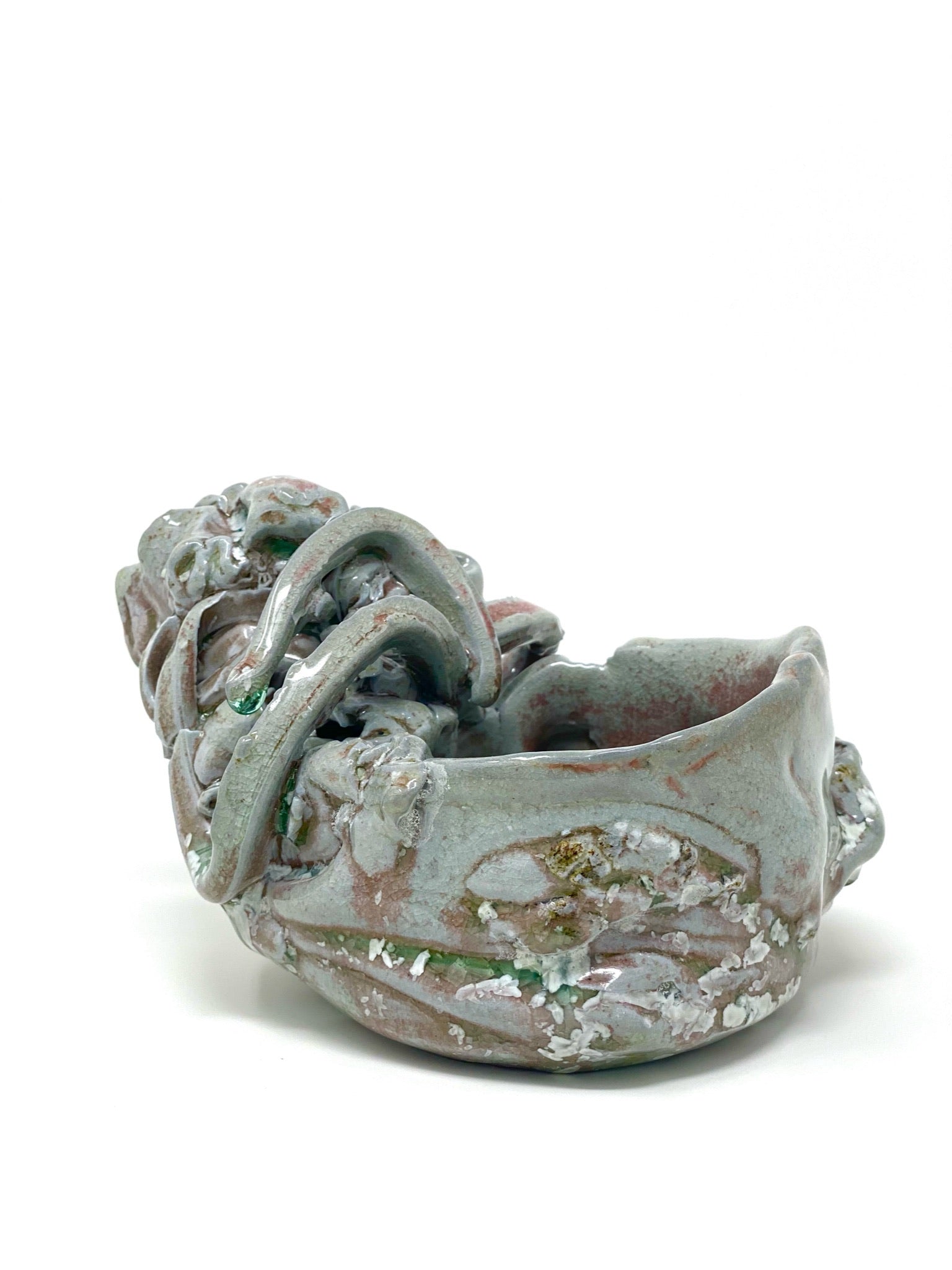 This unique sculptural stoneware bowl was influenced by the Japanese aesthetic of wabi-sabi. This pale mint green bowl with jade accents delicately dancing around the side, with flashes of deep red and a bold jade green interior base, embodies the wabi-sabi ethos of imperfection and transience.