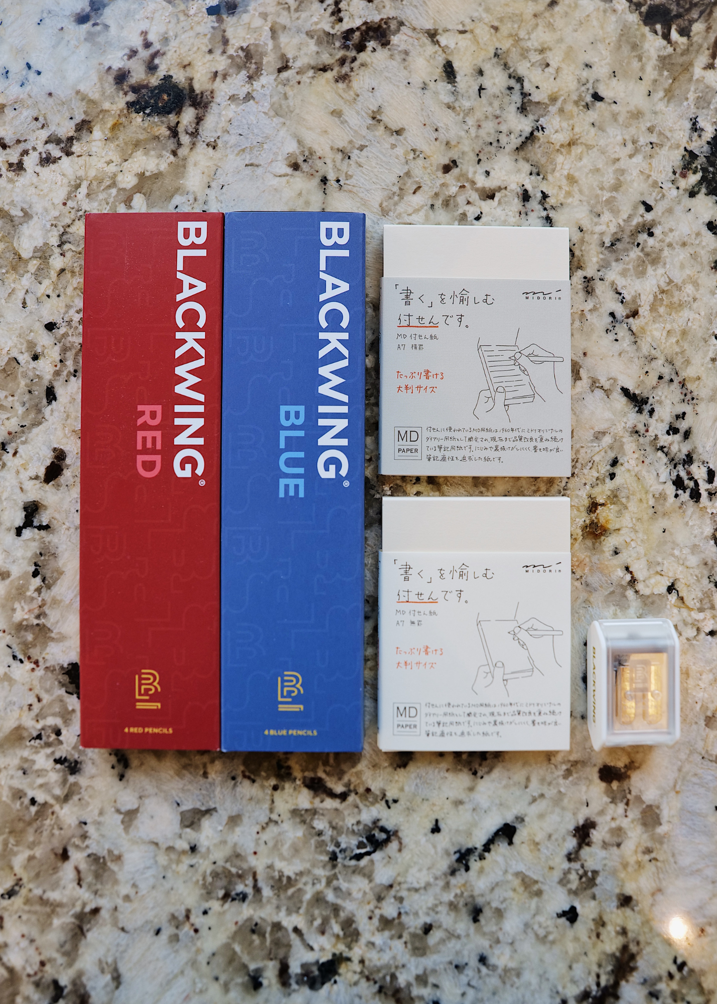 The Editor Bundle includes a core set of editing tools for both writers, drawers, and teachers alike. Blackwing pencils with non-photo cores make notating and scanning a breeze. Paired with a pencil sharpener and adhesive note set, editing on the go has never been easier.