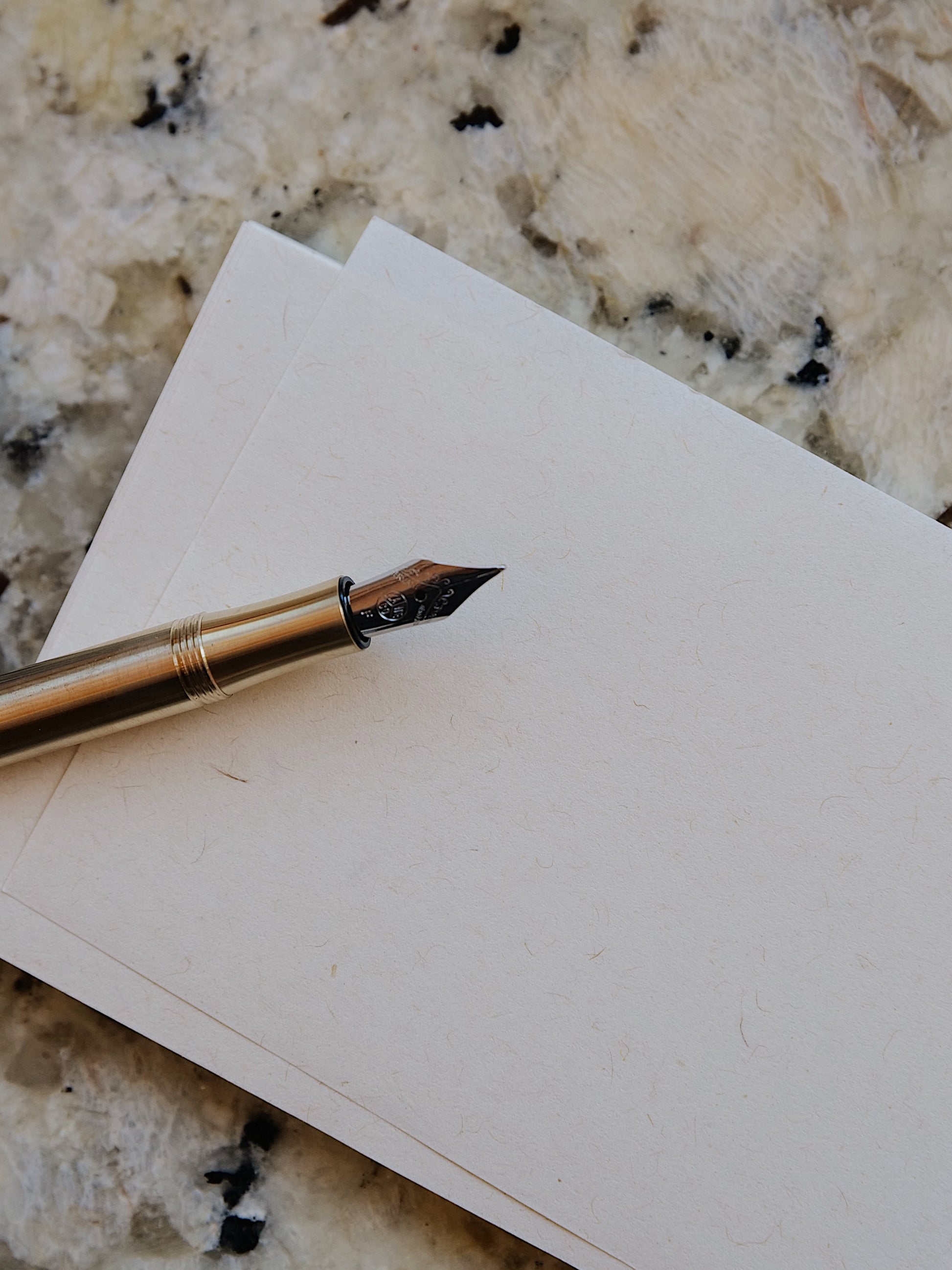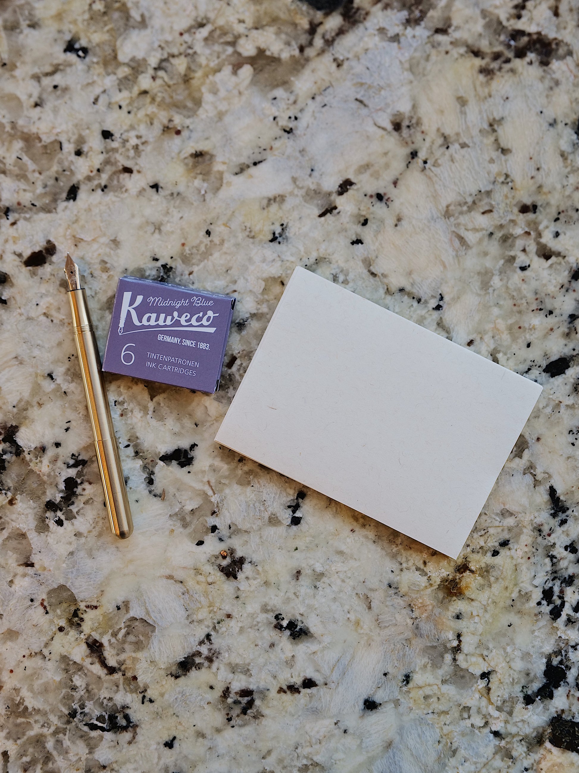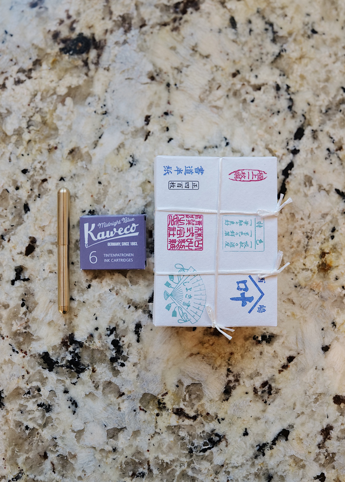 A thoughtful set to write notes, practice calligraphy or make small pieces of art. This bundle includes a set of beautiful Japanese wash paper, with multiple textures and styles, a brass Kaweco fountain pen, and a beautiful grey/purple fountain pen ink.