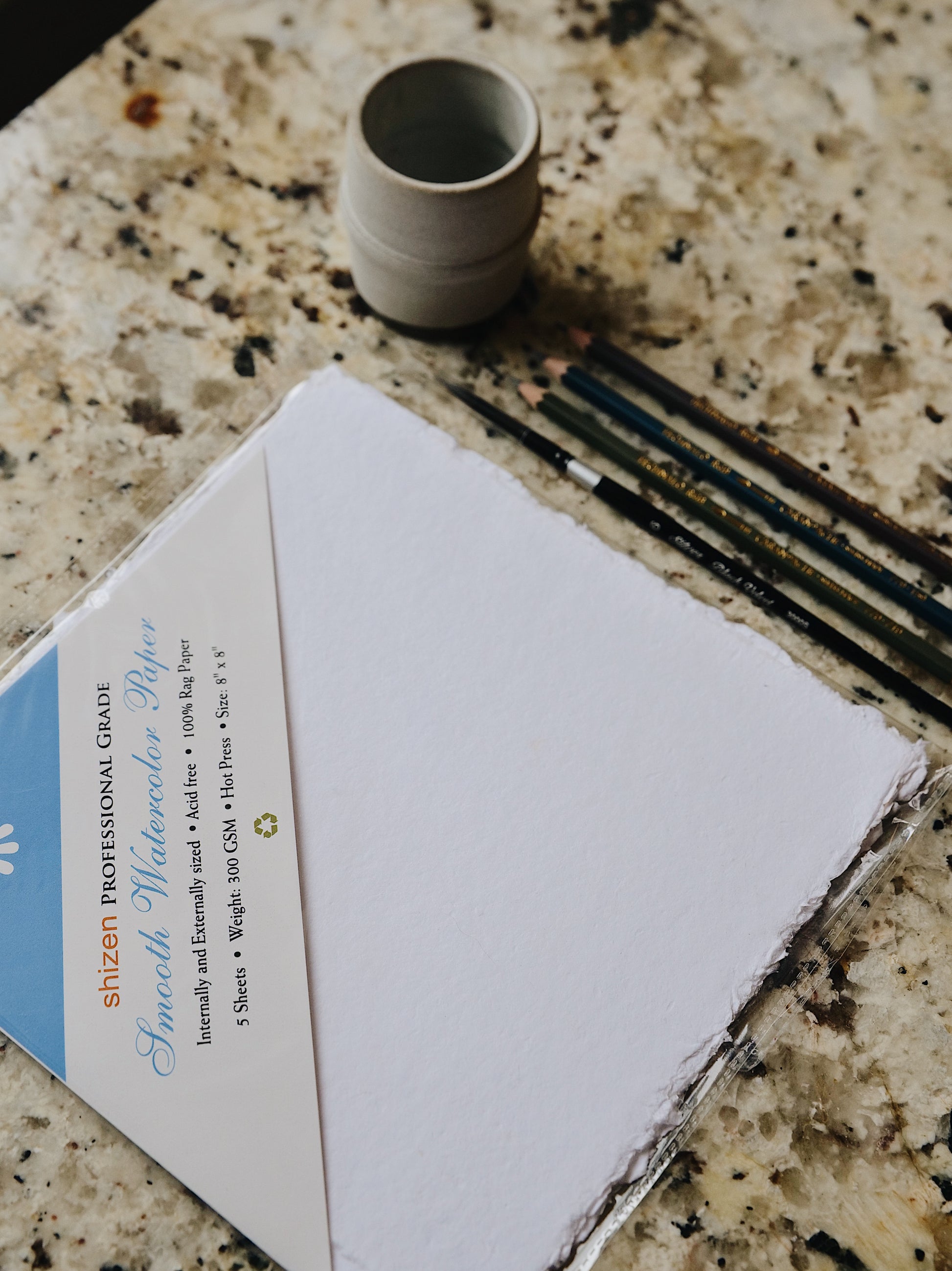 Set of five 8”x8” sheets of watercolor paper by Shizen Design. These sheets of 140Ib watercolor paper are made of 100% cotton rag with vegan sizing. The sheets are available in both hot and cold press. The cold will have a rougher, more defined texture. The hot will be a little smoother, with less surface noise. They're both soft, and take layers of color beautifully.